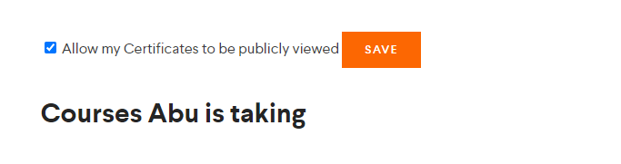 এই লিংক ব্রাউজরে কপি পেস্টে করে https://creativeclan.com.bd/learner/USERNAME/ (আপনার ইউজার নেম বসিয়ে নিন) নিচের মত অপশনে টিক দিয়ে সেভ করতে হবে। তাহলে আপনার সারটিফিকেট এর লিংক পাবলিক হবে এবং যে কোন মার্কেটপ্লেস বা প্রতিষ্ঠানের সাথে শেয়ার করতে পারবেন।